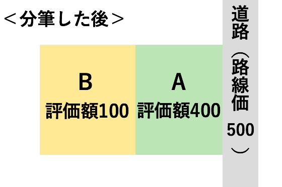 例えば、道路に面している1筆の土地を分筆して、「道路に面する土地A」と「道路に面さない土地B」に分けたとしましょう。Bの評価額が下がることで、土地全体としての評価額が抑えられます。