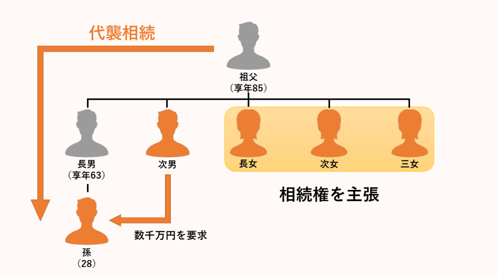 その状況で、祖父が85歳で亡くなりました。相続人は長男・次男・長女・次女・三女の5人です。しかし長男はすでに亡くなっているので、代襲相続で長男の子(孫)が相続人です。子は一人だったので代襲相続人はこの孫だけでした。