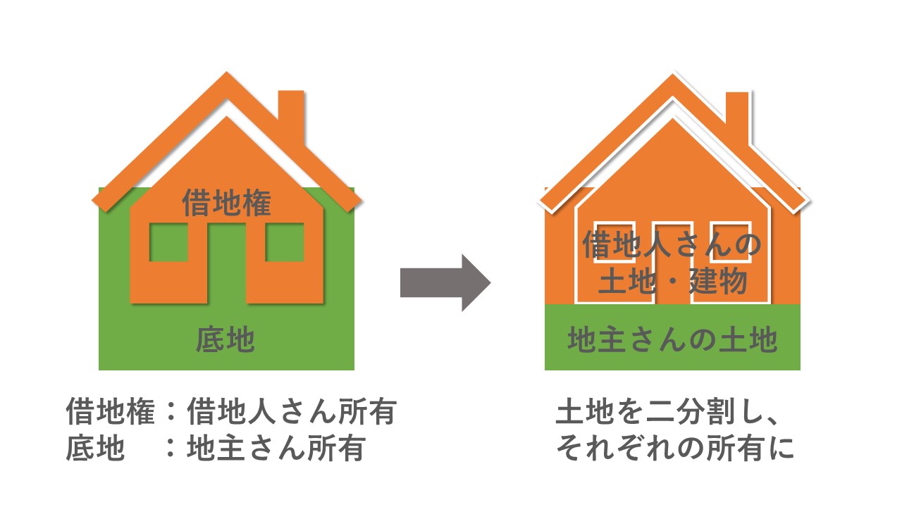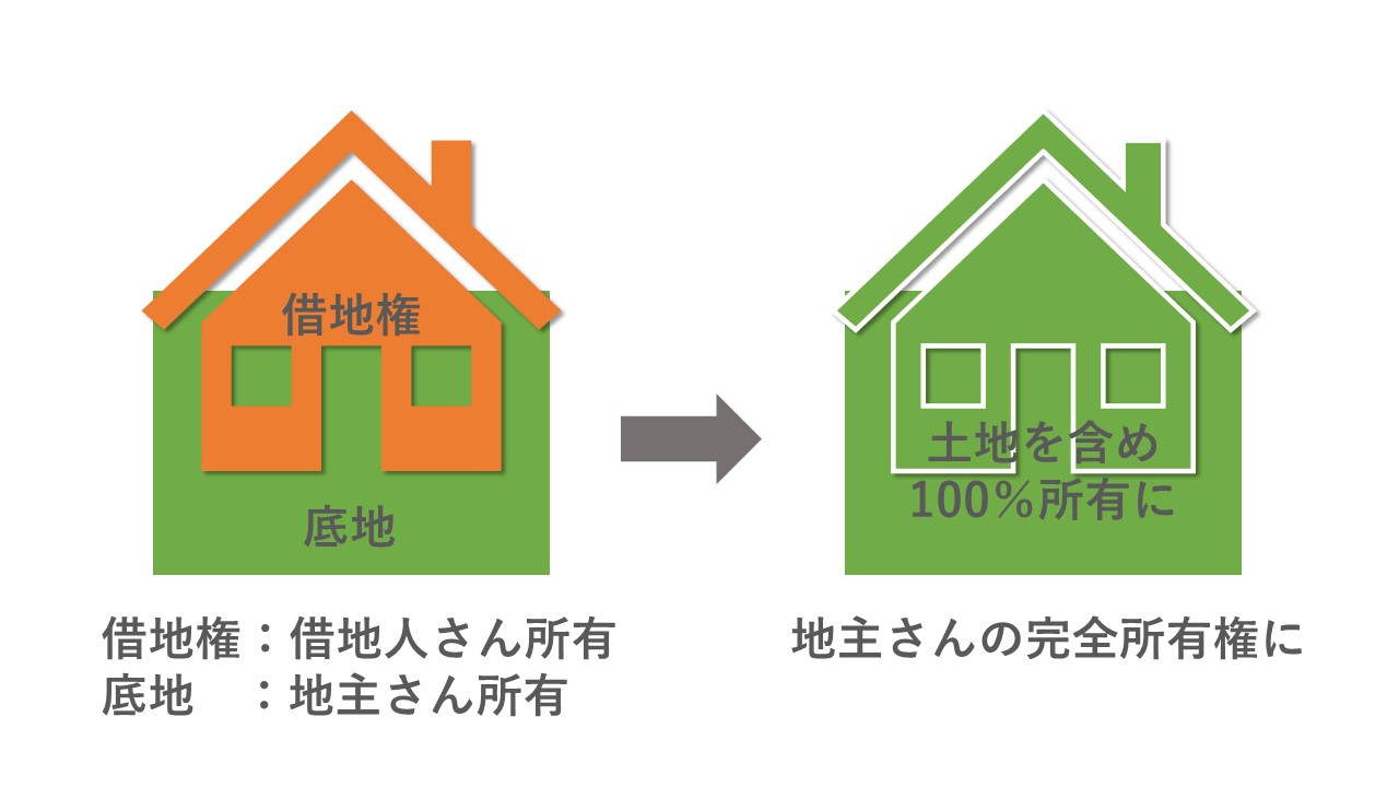 地主さんが借地人さんから借地権を購入し、地主さんの100%所有の状態に戻します。土地に建つ家は「借地人さんが取り壊す」「地主さんが家を買い取る」などの方法で処分します。