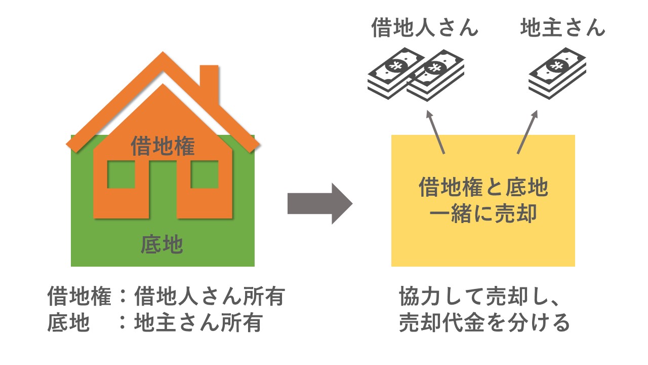 底地単独、借地単独で売却するとどうしても売却価格は低くなります。その点、地主と借地人が協力して売り出せば、売り主が二人いるとはいえ、購入者は100%所有ができるので、周辺の更地の相場価格に近い額で売れる可能性が高まります。