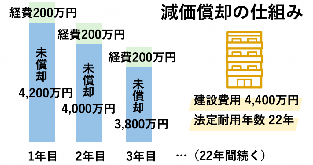 例えば、木造のアパートを4400万円で建設する場合で考えてみましょう。法定耐用年数の22年で減価償却するので、4400万円 ÷ 22年 = 200万円 となり、建ててから22年間は毎年、200万円を減価償却費として計上できます。