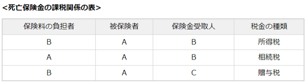 上図のように、保険料の負担者(契約者)と被保険者(保険の対象者)が同じ人の場合、死亡保険金は相続税の課税対象となることがわかると思います(上表の真ん中のケース)。
