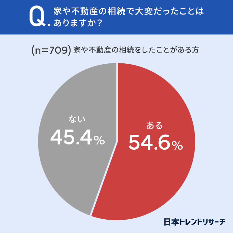 54.6%と半数以上の方が「家や不動産の相続で大変だったことはある」と回答しています。日本人の相続財産の約半分は不動産。円満な相続対策はなかなか難しいのが現実のようです。