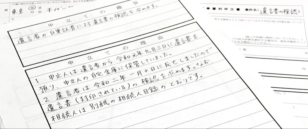 以下の書類を、遺言をのこした人が亡くなる時に居住していた地域(原則として住民票をおいていた地域)の家庭裁判所に提出します。申立ては遺言を見つけた人や相続人が「申立人」となって行います。