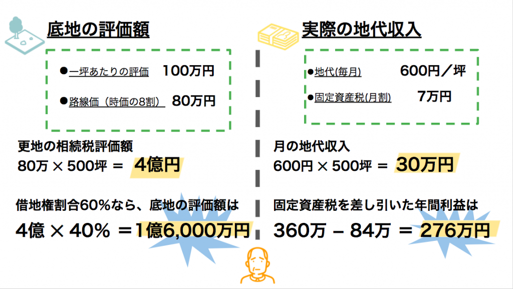 管理の手間がかからず、地代収入が自動的に振り込まれてくるだけなので、相続が起こるまでは気付きにくいかもしれません。しかし、底地を保有していることの問題はまさにこの「低収益高評価」という点なのです。