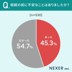 今回実施したアンケート調査では、相続を経験した人のうち45.3%が「相続前に不安を感じていた」と回答しました。