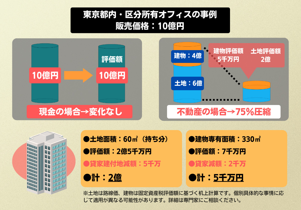 東京都内の区分所有オフィスの事例を紹介します。図解の通り、現金のままでは評価に変化はありませんが、不動産として所有することで評価額が変わり、節税効果の大きさがわかると思います。