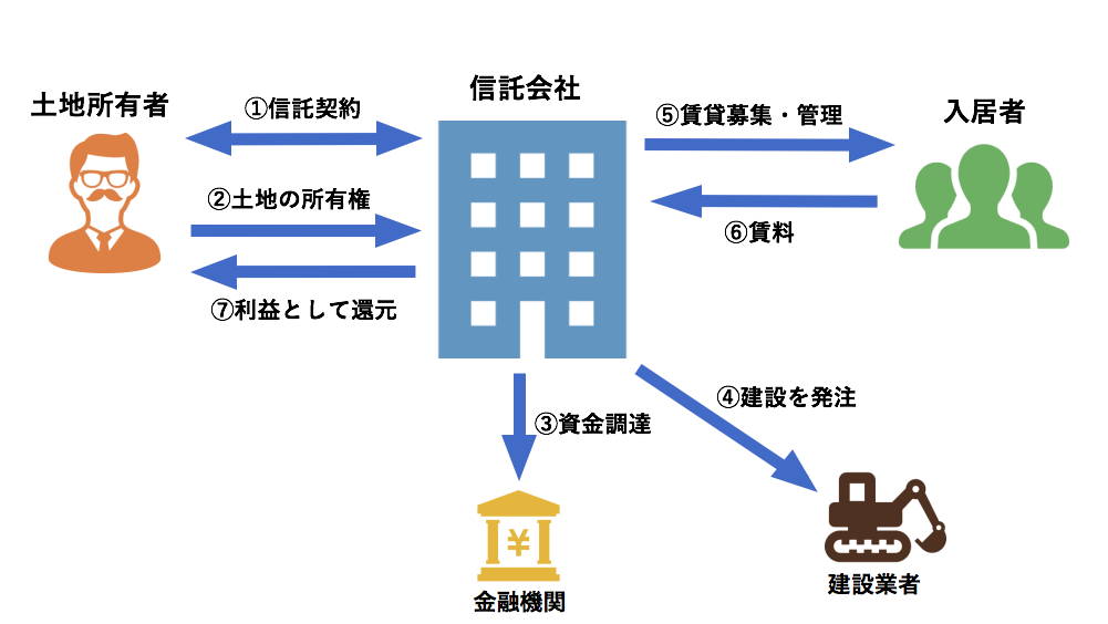必要なほとんどすべての手続きを信託銀行が行い、賃料から諸経費と信託銀行への報酬を差し引いた分が、利益として土地所有者に支払われます。信託の契約期間は10〜30年程度で、契約が終了すると、土地と建物が現状のまま土地所有者に返還されます。